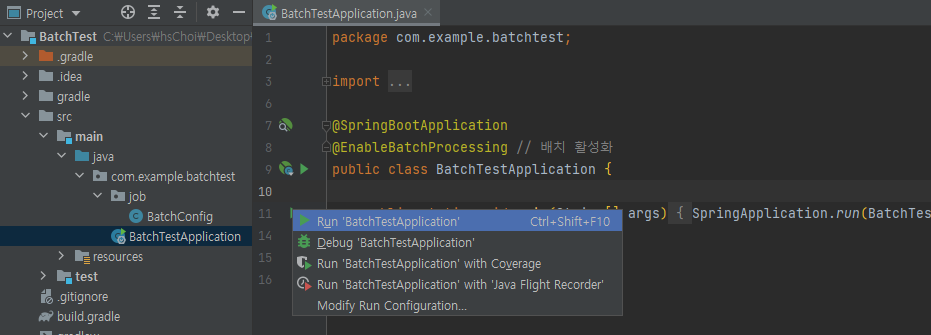 BatchTestApplication.java의 main 메소드를 실행해보자🤞