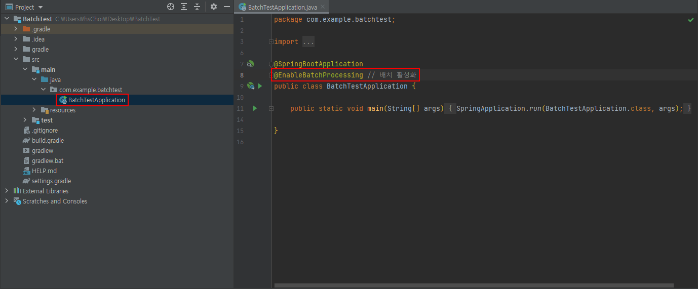 Spring Batch를 사용하기 위해 BatchTestApplication.java 파일에 @EnableBatchProcessing을 추가해준다❗