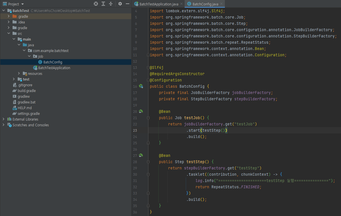 job이라는 패키지를 하나 만들고 BatchConfig.java 파일을 생성한 후 코드를 작성하자!