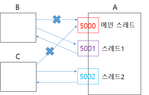 B가 A와 연결을 할 때 5000번 포트를 이용해 연결을 시도하고 연결이 되는 순간 5000번 소켓과의 연결은 끊어지고 새로운 소켓인 5001번 소켓과 연결이 된다.