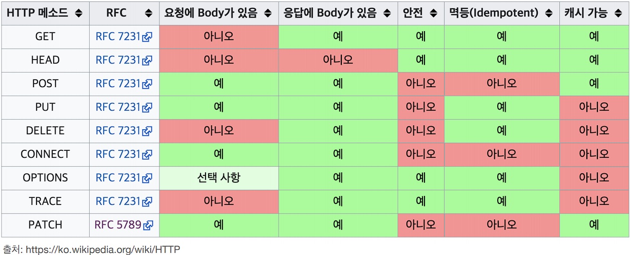 - 멱등(Idempotent Methods) - 몇 번을 호출하더라도 결과는 항상 같아야 한다. (외부 요인으로 중간에 리소스가 변경되는 것 까지는 고려하지 않는다.)