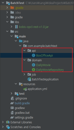 API를 가져와서 DB에 넣을 것이기 때문에 api 패키지와 domain인 패키지를 생성한다